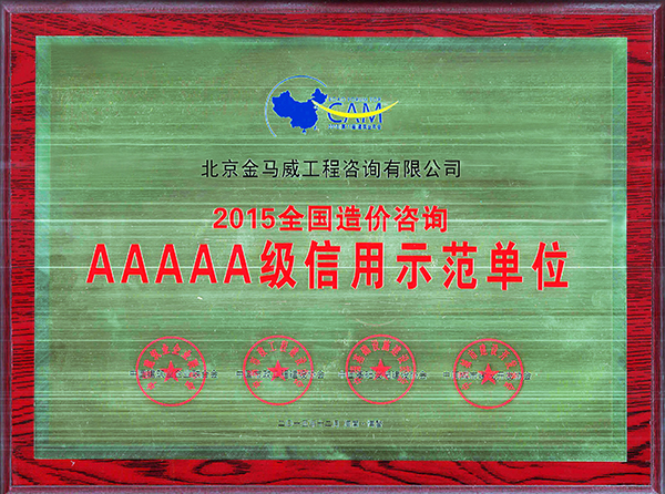 公司榮獲“2015全國造價咨詢AAAAA級信用示范單位”