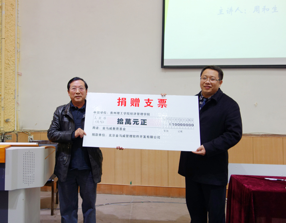 2014年12月5日下午,公司董事長周和生向貴州理工學院經濟管理學院捐贈“建設項目全過程投資管理與審計系統”軟件,并向學院捐贈十萬元教學基金,大力支持學校教學和科研工作。